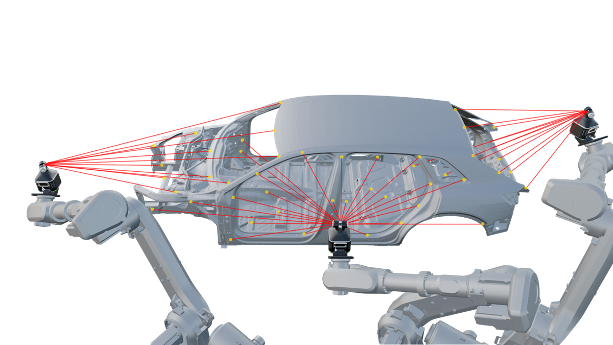 An jeder Messposition wird eine Ausrichtung an der Bauteilaufnahme vorgenommen, um Abweichungen des Roboters aus den Ergebnissen zu eliminieren. Dank vereinfachter, vorprogrammierter Roboterpositionen müssen die Roboter bei Modifikationen und Ergänzungen nicht umprogrammiert werden.