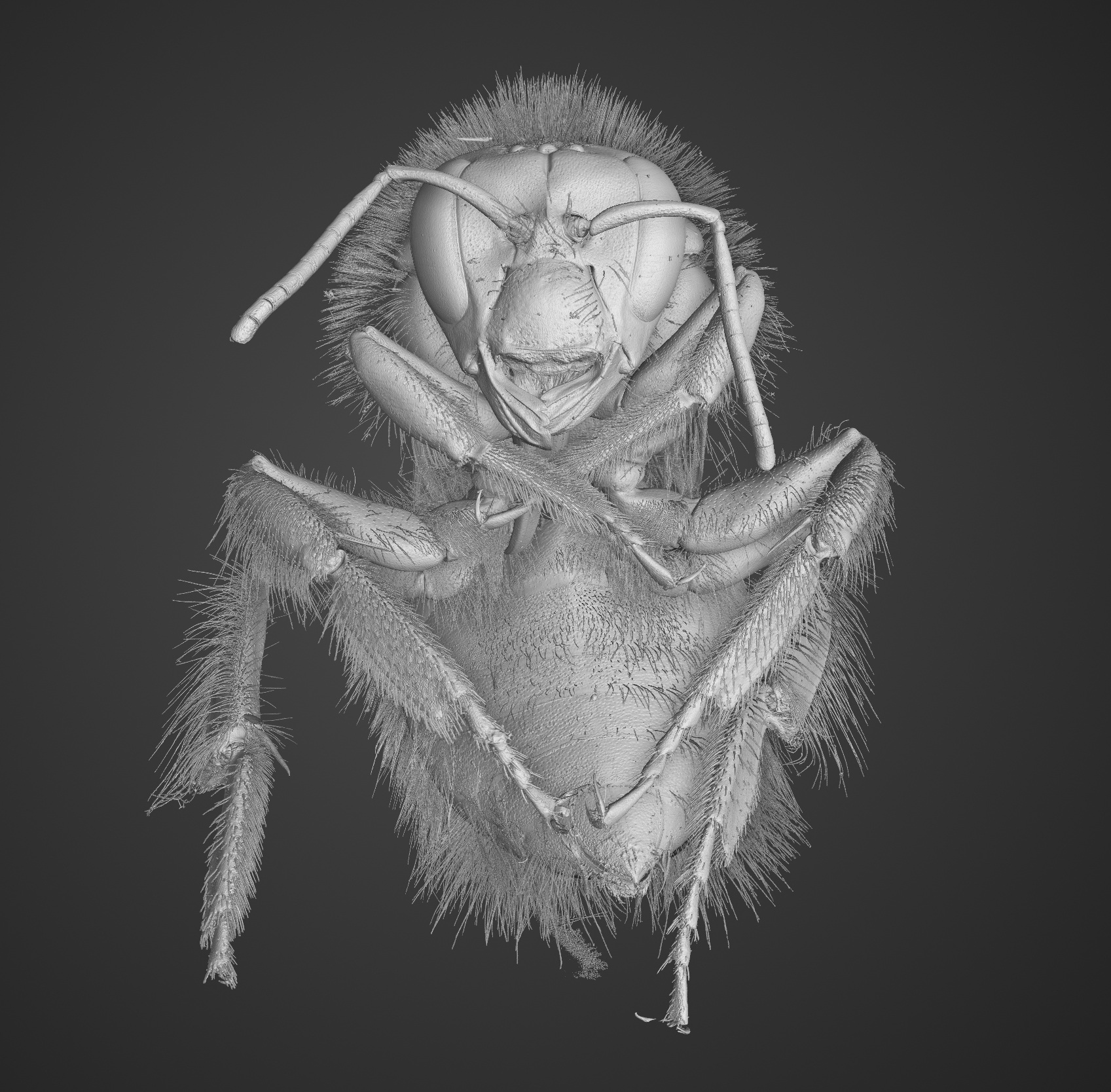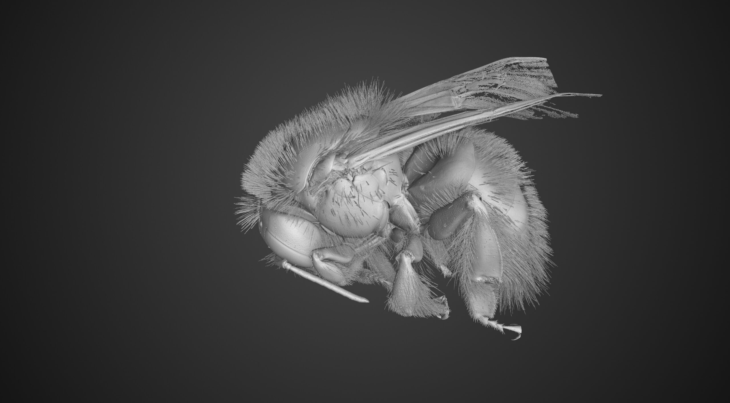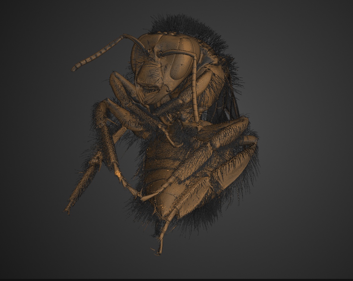 The bumblebee was scanned using the XT H 225 ST 2x system, equipped with a 225 kV multi-metal Static Reflection target with a silver target. For this application, the system was operated at 60 kV and 7 W, a configuration chosen to enhance contrast across low-density biological structures while maintaining fine structural fidelity. Data was acquired using a Circular CT scan technique in combination with a Varex XRD 4343CT detector.