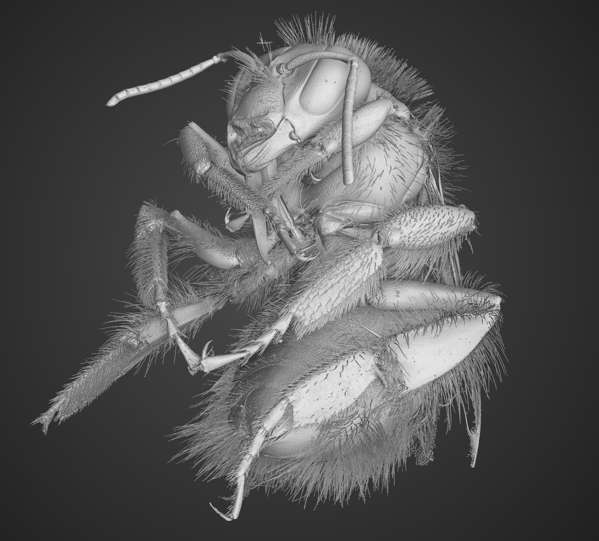 The reconstructed volumetric dataset reveals the extraordinary internal complexity of the bumblebee. Within the thorax, dense indirect flight muscles, responsible for the insect’s rapid wingbeats, are clearly distinguishable. The segmentation also highlights variations in exoskeletal thickness, fine joint geometries at the wing articulation points, and internal air sac structures that contribute to flight efficiency.