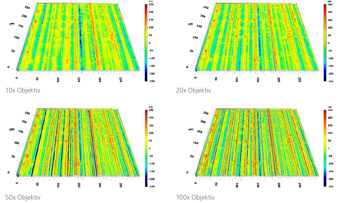 The Mirau configuration integrates a miniaturized beam splitter and reference mirror directly within the objective, whereas in the Michelson configuration these components are located externally. Michelson objectives offer a comparatively wide field of view, long working distance, and low magnification, typically up to 5×, making them particularly well suited for high-resolution roughness and texture measurements. Mirau objectives, in contrast, enable higher magnifications of up to 100× and are optimized for applications requiring fine lateral resolution over smaller measurement fields.
