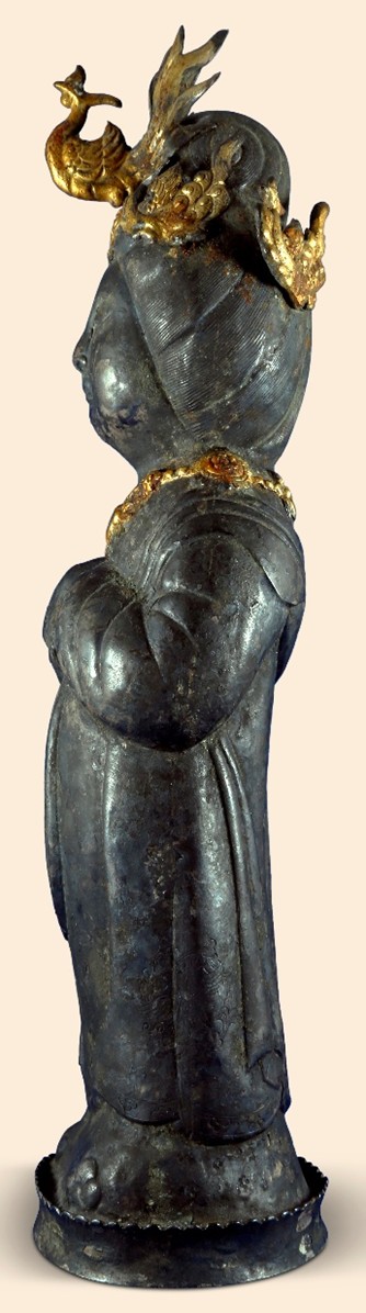 Visual inspection of the statuette had already allowed historians Wang Shuanghuai, Professor of History at Shaanxi Normal University in Xi’an, China, and Fang Jun, Professor of History at Huron University in Ontario, Canada, to confirm that the physiognomic features, including draconic eyes, broad face and square forehead, and other physical markers such as a phoenix neck, match historical descriptions of Wu Zetian in ancient texts. Likewise, the clothing and headdress were noted to be comparable with ceremonial apparel of the time.