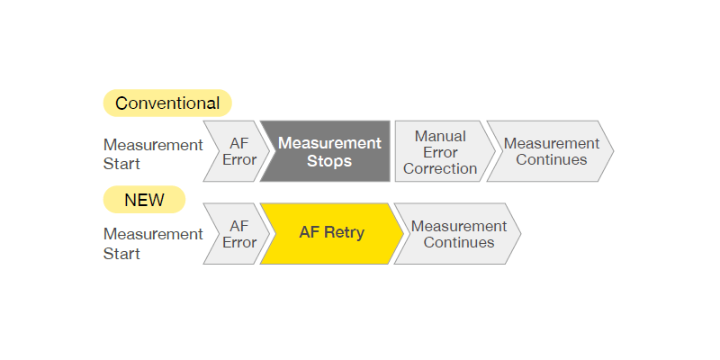 Prevents measurement interruption by automatically retrying AF until it is successful. Operators are needed only at the start of measurement, greatly reducing on-site workload.