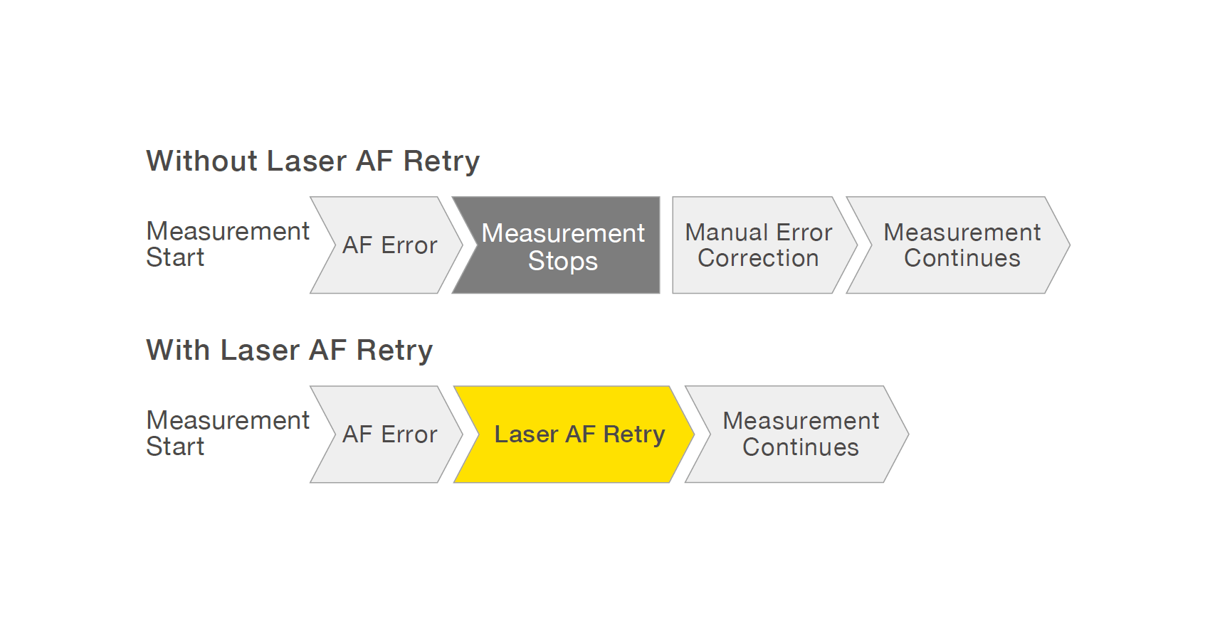 ป้องกันการหยุดชะงักของการวัดโดยการลองโฟกัสอัตโนมัติใหม่จนกว่าจะสำเร็จ จำเป็นต้องมีผู้ปฏิบัติงานแค่เฉพาะในช่วงเริ่มต้นการวัดเท่านั้น ซึ่งช่วยลดภาระงานในสถานที่ปฏิบัติงานได้อย่างมาก